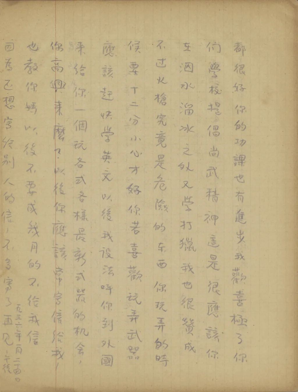 剛才我下班回來后,接到了你一月三日那封信和你的分數(shù)表,知道你媽和兩個小妹妹都很好,你的功課也有進步,我歡喜極了。你們學校提倡尚武精神,這是很應該。你在泅水溜冰之外又學打獵,我也很贊成。不過火槍究竟是危險的東西,你玩弄的時候要十二分小心才好。你若喜歡玩弄武器,應該趕快學英文,以后我設法叫你到外國來,給你一個玩各式各樣最新式[武]器的機會,你高興來么?以后你應該常寫信給我,也教你媽以后不要成幾月的不給我信。因為還想寫給別人的信,不多寫了,再見。