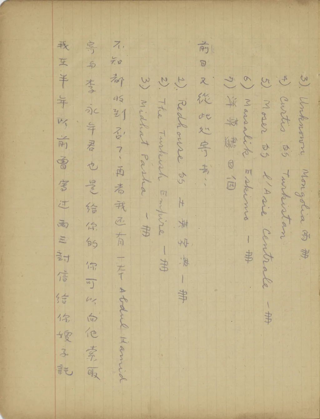 不知都收到否?再者,我還有一本Abdul Hamid,寄與李永年君,也是給你的,你可以向他索取。我在半年以前曾寫過兩三封信給你嫂子,托她將《嘉慶重修大清一統(tǒng)志》中關(guān)于西藏青海川邊的部份曬印兩份,一份給我寄來,一份留在北平,請人用國語羅馬寄〔字〕作一份索引。她不但沒有曬一份給我寄來,且是索引作來沒有作,她來信連提也不提。請你見信后,立時去問她一聲,復我一封快信。