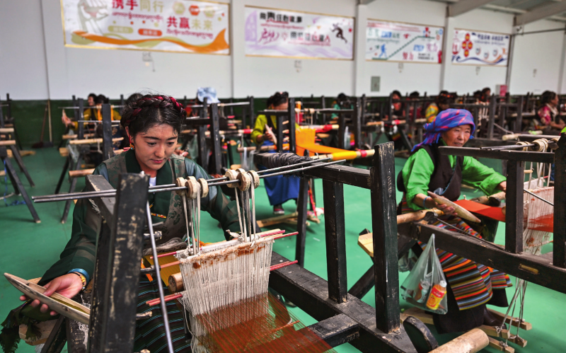在西藏日喀則市仁布縣特色產(chǎn)業(yè)孵化園,亞德細(xì)褐羊毛織品農(nóng)民專業(yè)合作社工作人員在車間里織布(2024年9月1日攝)孫瑞博攝