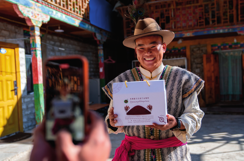 在西藏日喀則市定結(jié)縣陳塘鎮(zhèn),自媒體博主夏爾巴人旦增在拍攝視頻推介當(dāng)?shù)靥禺a(chǎn)雞爪谷糌粑(2024年12月13日攝)丁增尼達(dá)攝