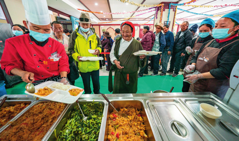 在西藏那曲市色尼區(qū)老年人日間照料中心,老人們?cè)谂抨?duì)打飯(2025年4月25日攝)丁增尼達(dá)攝