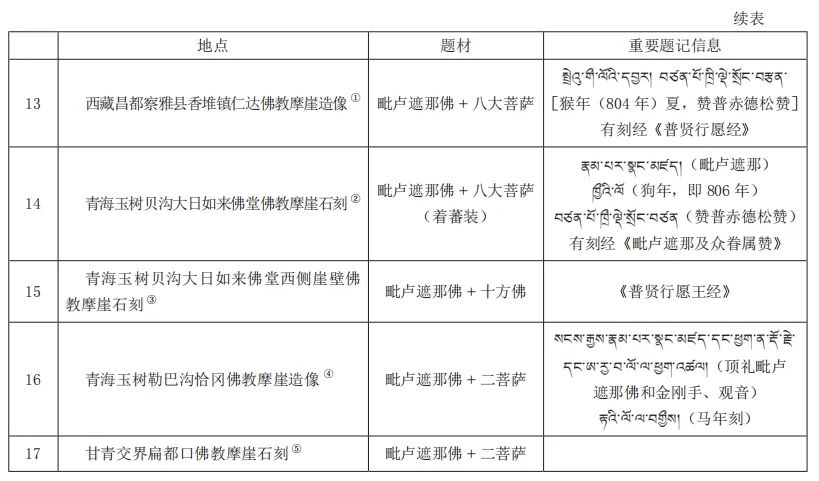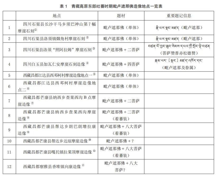 迄今在青藏高原東部發(fā)現(xiàn)的20余處吐蕃時期佛教摩崖石刻造像中,毗盧遮那佛的題材超過半數(shù),凸顯出這一時期以毗盧遮那佛為主尊的信仰的盛行。毗盧遮那佛無論是作為單體造像出現(xiàn),還是與二菩薩、八菩薩或十方佛呈組合出現(xiàn),其圖像特征均為頭戴三花冠、雙手結(jié)禪定印、結(jié)跏趺坐于蓮花座上,有些蓮座下方還有雙獅支撐;值得注意的是,有幾處毗盧遮那佛及其眷屬造像均穿著蕃裝,類似吐蕃贊普的形象,不同于其他上身袒露、僅斜披帛帶的裝束?,F(xiàn)將能夠確認毗盧遮那佛主尊身份的造像地點及其題材組合列舉如表1所示,其中在列表中的第1、2、4、14等處地點均發(fā)現(xiàn)有標(biāo)明造像身份的藏文題記“??????????????”,為梵文Vairocana的藏譯,有“太陽”之義,意譯遍照或光明遍照,漢語音譯為毗盧遮那或毗盧舍那,意譯為大日如來。結(jié)合題記和造像特征,這批摩崖石刻造像題材的主尊為毗盧遮那佛無疑。