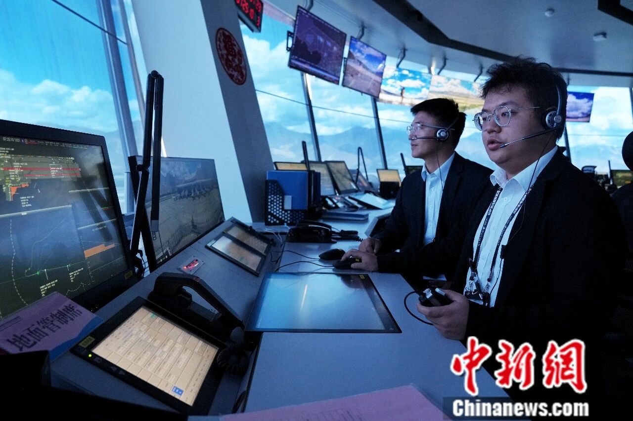 2025年7月22日,塔臺(tái)管制室?guī)О嘀魅蔚┰觯ㄗ螅刈澹┡c見(jiàn)習(xí)管制員管羽揚(yáng)(右)在拉薩貢嘎國(guó)際機(jī)場(chǎng)塔臺(tái)指揮航班進(jìn)離場(chǎng)。據(jù)悉2025年是西藏自治區(qū)成立60周年,也是西藏民航通航60周年。中新社記者張祥毅攝