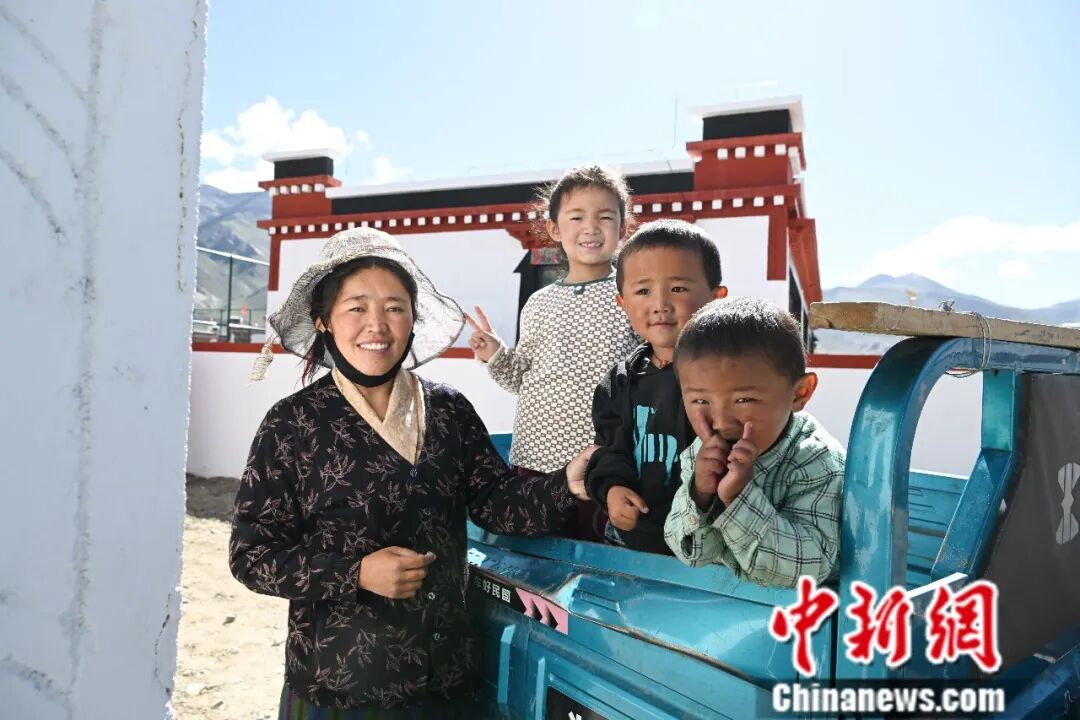 2025年8月15日,西藏日喀則市定日縣森嘎村舉行“定日6.8級(jí)地震災(zāi)后恢復(fù)重建民房首批入住儀式”。圖為森嘎村一戶(hù)村民一家在新房門(mén)口。中新社記者貢嘎來(lái)松攝