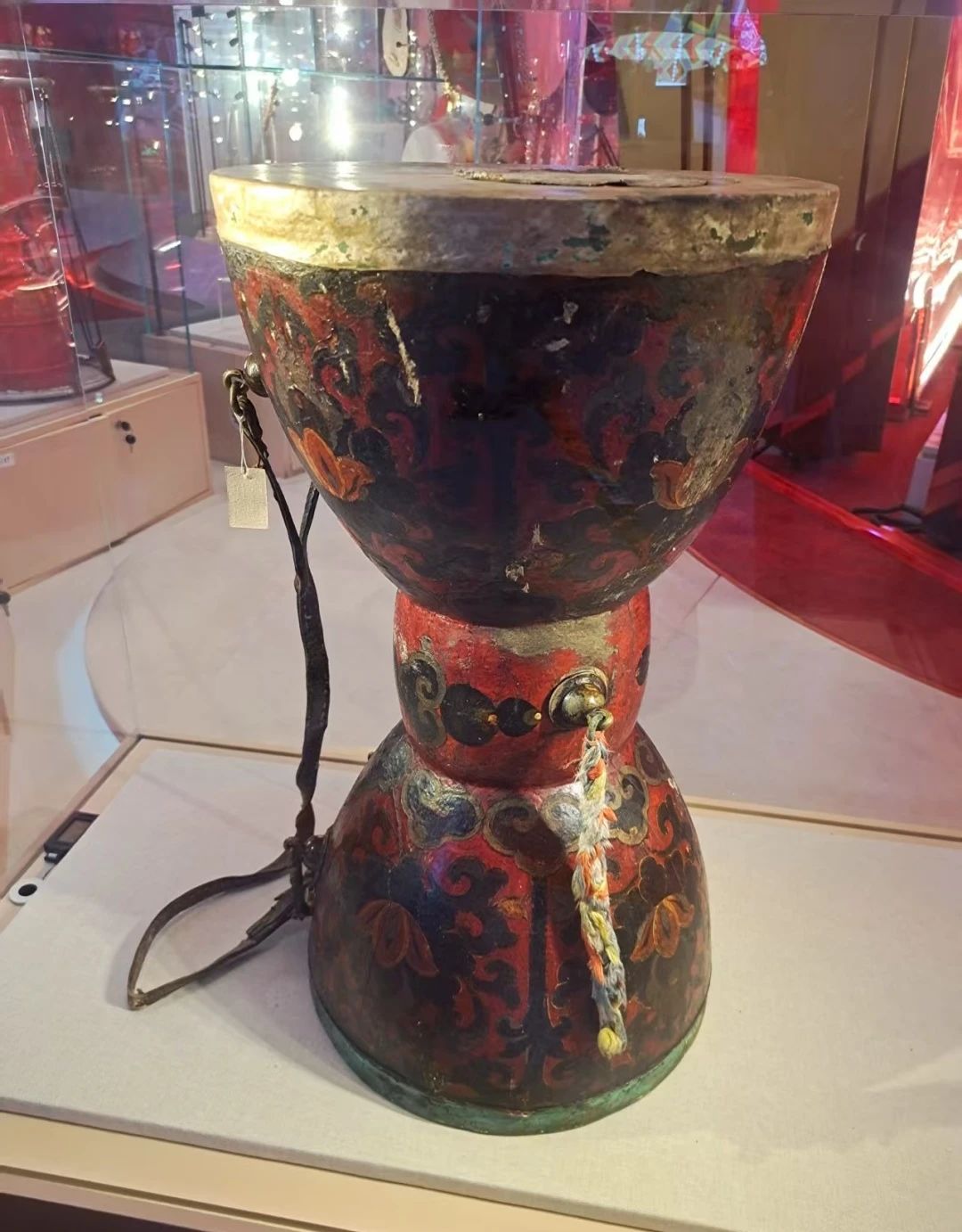▲文成公主帶到西藏的長(zhǎng)鼓。在長(zhǎng)鼓的兩端拴有一條皮帶,演奏者用皮帶將長(zhǎng)鼓系在腰間,一邊舞動(dòng)身體,一邊用兩手分別拍打兩側(cè)的鼓面咚咚作響。在長(zhǎng)鼓中間最細(xì)窄處還系有麻繩,可將其懸掛在樂器架上。(圖片來源:民族文化宮鑄牢中華民族共同體意識(shí)文物古籍展)