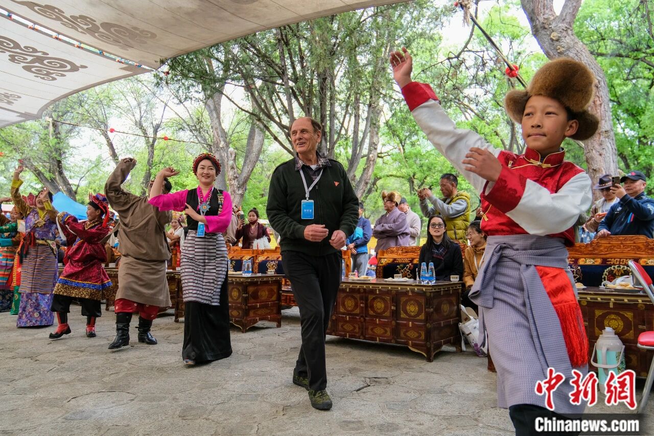 2023年5月19日,柯馬凱在拉薩羅布林卡聽藏戲,和當(dāng)?shù)夭刈迕癖娨坏捞伹f舞。中新社記者江飛波攝