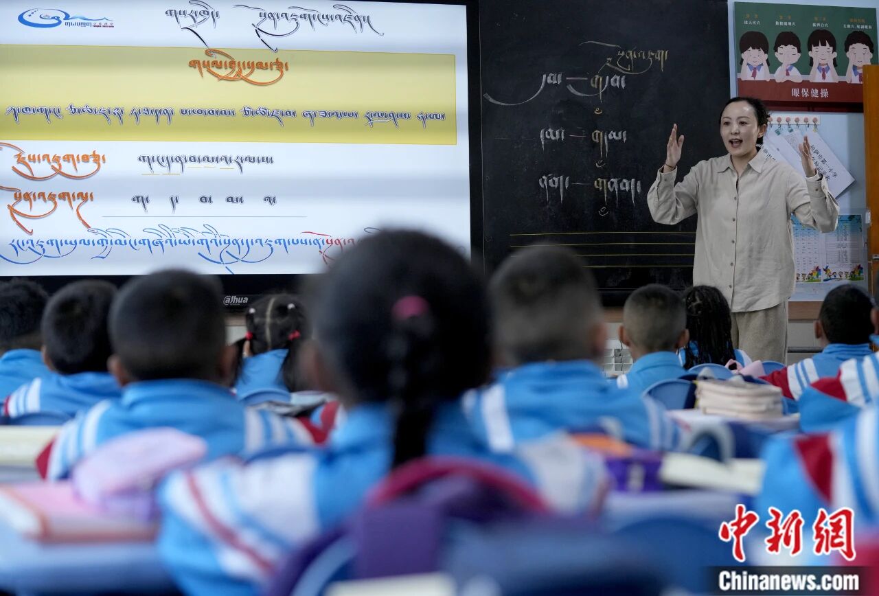 2025年3月10日,拉薩市第一小學(xué)藏語文老師桑旦旺姆使用科技設(shè)備在課堂上講授藏語。中新社記者李林?jǐn)z