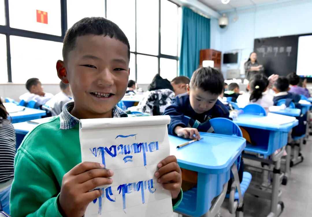2024年8月20日,拉薩市第一小學(xué)一年級八班迎來藏語文課。圖為學(xué)生展示書寫的藏文。中新社記者李林?jǐn)z