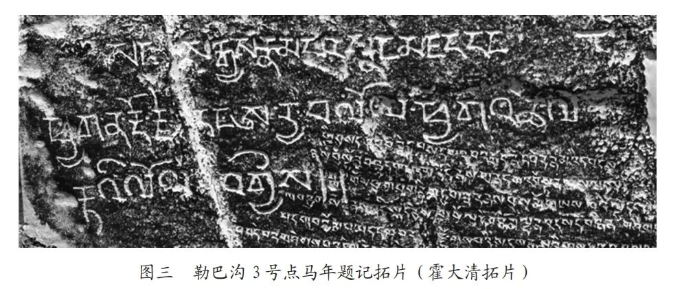 另外在距離勒巴溝溝口“贊普禮佛圖”約4000米的恰岡石刻,由藏文題刻和摩崖造像兩部分組成。造像由主尊(大日如來)、觀世音、金剛手以及供養(yǎng)天女四部分組成。藏文題記(圖三)刻寫于造像下方,錄文及翻譯如下: