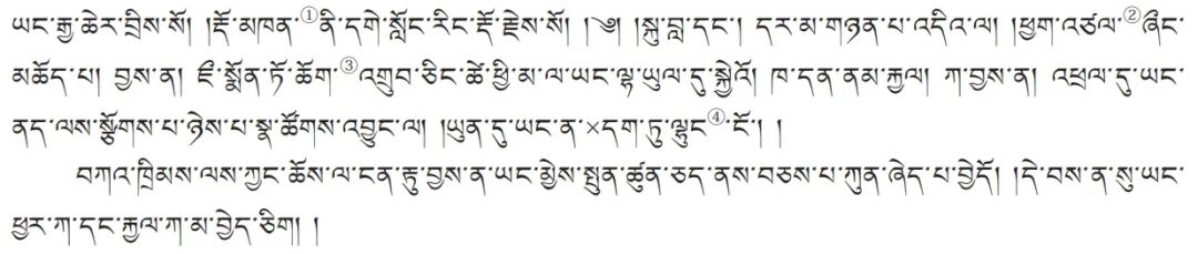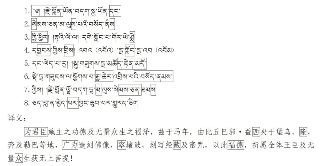 譯文:狗年,浮雕眾佛像及繕寫如上所有經(jīng)文之祝愿等,為今上贊普墀德松贊之世君臣、施主及一切眾生之故也。此乃比丘大譯師益西央主持、工巧比丘仁欽囊則、杰桑、班丹及工匠人等均行妙善事業(yè),自祖俄村雇用力士,在崖面刻寫佛像、經(jīng)文及三寶之所依,眾生之任何人或目睹,或觸摸,或禮敬,或聽聞,或憶念,其福德及智慧之力,均回向贊普父子及一切眾生,登于無上菩提也。此愿!