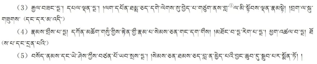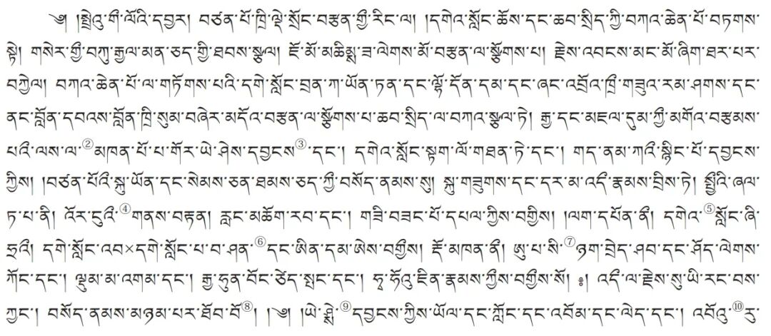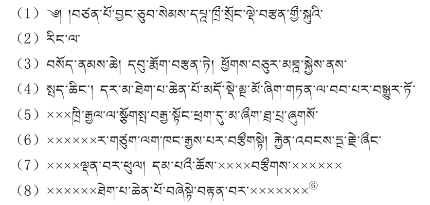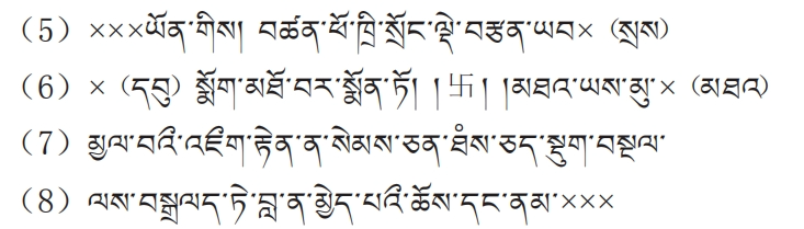 此通摩崖題刻是墀松德贊執(zhí)政晚期的造像題刻,距此以北90公里左右有須巴神山石刻群,與照阿拉姆摩崖石刻屬同一時期的遺跡。須巴神山石刻群是墀松德贊及墀德松贊父子執(zhí)政過渡時期的題刻。須巴神山第5鋪石刻古藏文題記共8行,其中1—4行是經(jīng)咒,從第5行起錄文及翻譯如下: