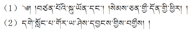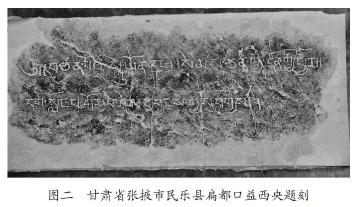 扁都口摩崖石刻位于今甘肅省張掖市民樂縣,在原來石刻的位置現(xiàn)修建有寺廟,名為“石佛寺”。所在位置海拔高度為3073米,北緯38.141°、東經(jīng)100.927°。石刻所在崖壁方向為北偏西6°,崖面傾斜度為96°。石刻內(nèi)容為一佛二菩薩,在右側(cè)菩薩的右下方刻有一小佛。圖像的左下方刻有藏文題記(圖二),共兩行,寬0.5米、高0.21米,距地面0.92米,行距0.05米。錄文及翻譯如下: