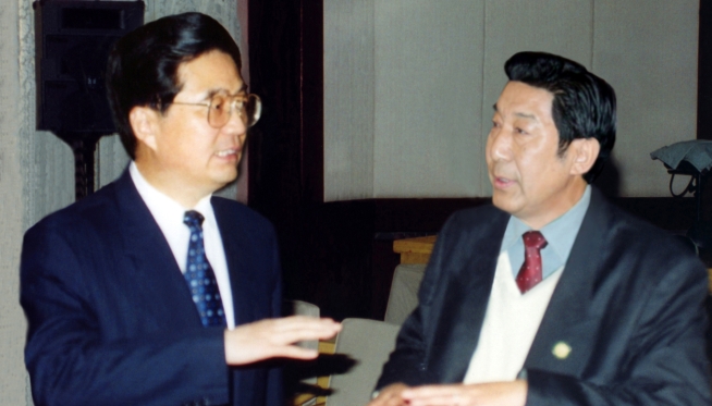 2000年10月26日 中央政治局常委、國(guó)家副主席胡錦濤與拉巴平措總干事交談